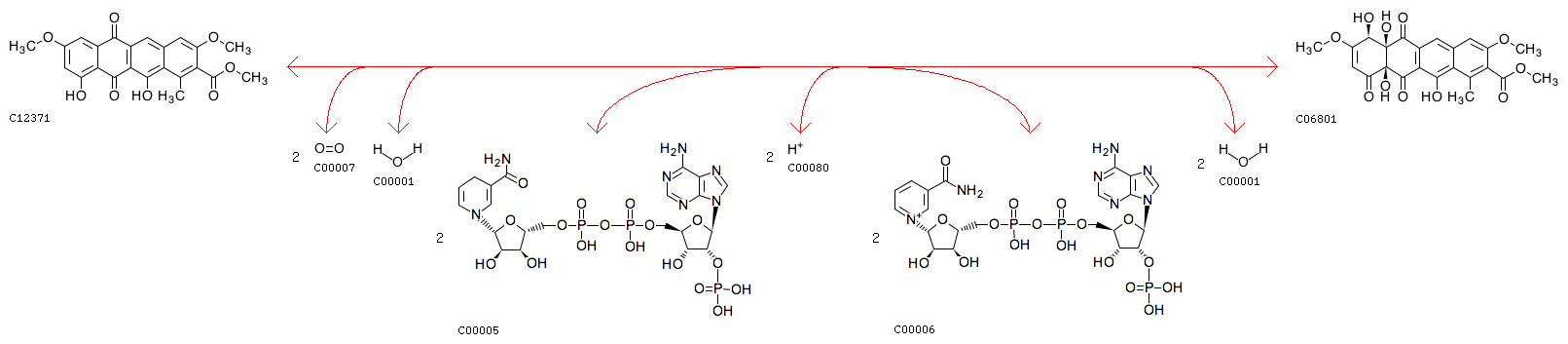 R06704 Tetracenomycin A2 + 2 Oxygen + H2O + 2 NADPH + 2 H+ <=> Tetracenomycin C + 2 NADP+ + 2 H2O