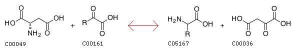 L-Aspartate + 2-Oxo acid <=> alpha-Amino acid + Oxaloacetate