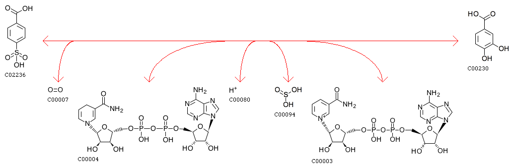 R01636 4-Sulfobenzoate + Oxygen + NADH + H+ <=> 3,4-Dihydroxybenzoate + Sulfite + NAD+