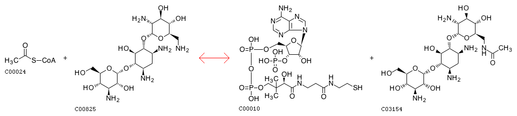 R01889 Acetyl-CoA + Kanamycin B <=> CoA + N6'-Acetylkanamycin-B