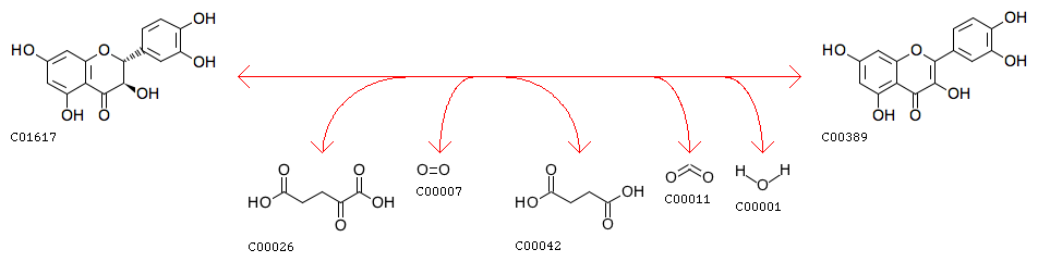 R02160 Taxifolin + 2-Oxoglutarate + Oxygen <=> Quercetin + Succinate + CO2 + H2O