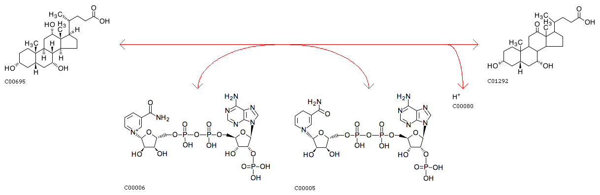 R02793 Cholic acid + NADP+ <=> 3alpha,7alpha-Dihydroxy-12-oxo-5beta-cholanate + NADPH + H+