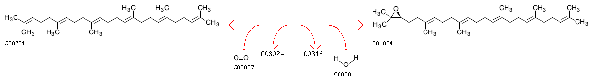 R02874 Squalene + Oxygen + [Reduced NADPH---hemoprotein reductase] <=> (S)-2,3-Epoxysqualene + [Oxidized NADPH---hemoprotein reductase] + H2O