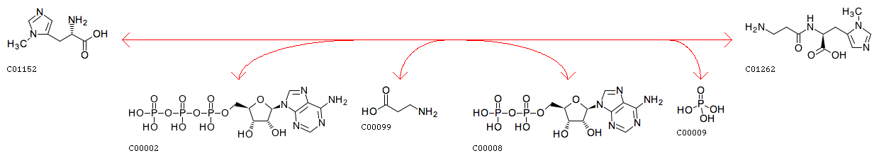 R03286 ATP + N(pi)-Methyl-L-histidine + beta-Alanine <=> ADP + Orthophosphate + beta-Alanyl-N(pi)-methyl-L-histidine