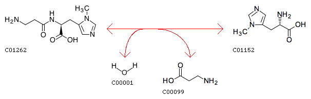R03288 beta-Alanyl-N(pi)-methyl-L-histidine + H2O <=> beta-Alanine + N(pi)-Methyl-L-histidine