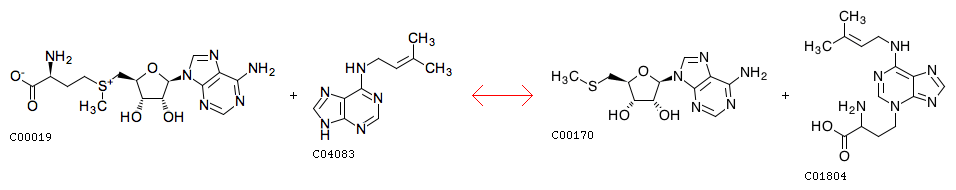 R03726 S-Adenosyl-L-methionine + N6-(Delta2-Isopentenyl)-adenine <=> 5'-Methylthioadenosine + Discadenine