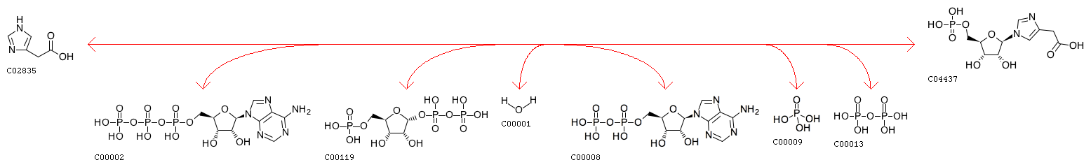 R04068 ATP + Imidazole-4-acetate + 5-Phospho-alpha-D-ribose 1-diphosphate + H2O <=> ADP + Orthophosphate + 1-(5-Phosphoribosyl)imidazole-4-acetate + Diphosphate