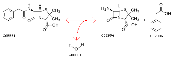 Penicillin G + H2O <=> 6-Aminopenicillanate + Phenylacetic acid