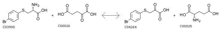 R04338 S-(4-Bromophenyl)-L-cysteine + 2-Oxoglutarate <=> 3-[(4-Bromophenyl)sulfanyl]-2-oxopropanoate + L-Glutamate