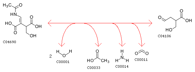 | Definition | 2-(Hydroxymethyl)-3-(acetamidomethylene)succinate + 2 H2O <=> Acetate + 2-(Hydroxymethyl)-4-oxobutanoate + Ammonia + CO2