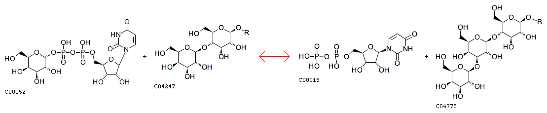 R04431 UDP-alpha-D-galactose + D-Galactosyl-(1->4)-beta-D-glucosyl-R <=> UDP + D-Galactosyl-(1->3)-beta-D-galactosyl-(1->4)-beta-D-glucosyl-R