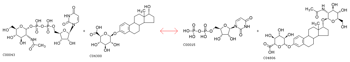 R04451 UDP-N-acetyl-alpha-D-glucosamine + Estradiol-17alpha 3-D-glucuronoside <=> UDP + 17alpha-(N-Acetyl-D-glucosaminyl)-estradiol 3-D-glucuronoside