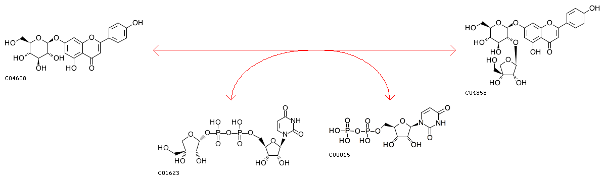 R04526 UDP-apiose + Apigenin 7-O-beta-D-glucoside <=> UDP + Apigenin 7-O-[beta-D-apiosyl-(1->2)-beta-D-glucoside]