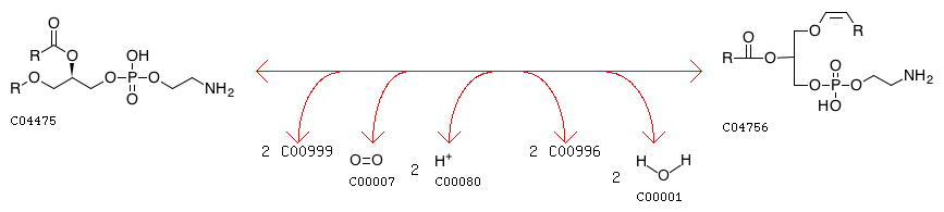 R04571 1-Alkyl-2-acylglycerophosphoethanolamine + 2 Ferrocytochrome b5 + Oxygen + 2 H+ <=> O-1-Alk-1-enyl-2-acyl-sn-glycero-3-phosphoethanolamine + 2 Ferricytochrome b5 + 2 H2O