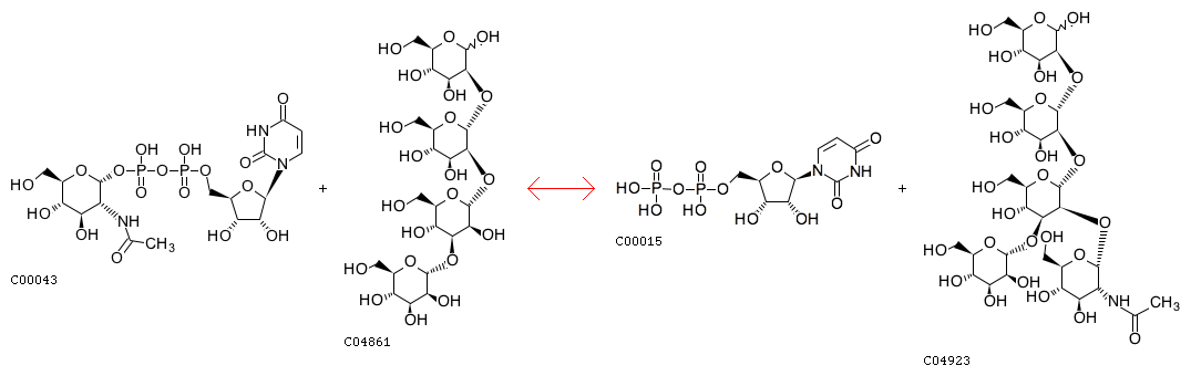 R04619 UDP-N-acetyl-alpha-D-glucosamine + 1,3-alpha-D-Mannosyl-1,2-alpha-D-mannosyl-1,2-alpha-D-mannosyl-D-mannose <=> UDP + 1,3-alpha-D-Mannosyl-(1,2-N-acetyl-alpha-D-glucosaminyl)-1,2-alpha-D-mannosyl-1,2-alpha-D-mannosyl-D-mannose