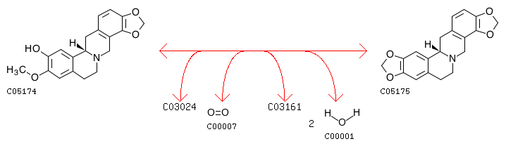 R04690 (S)-Cheilanthifoline + [Reduced NADPH---hemoprotein reductase] + Oxygen <=> Stylopine + [Oxidized NADPH---hemoprotein reductase] + 2 H2O