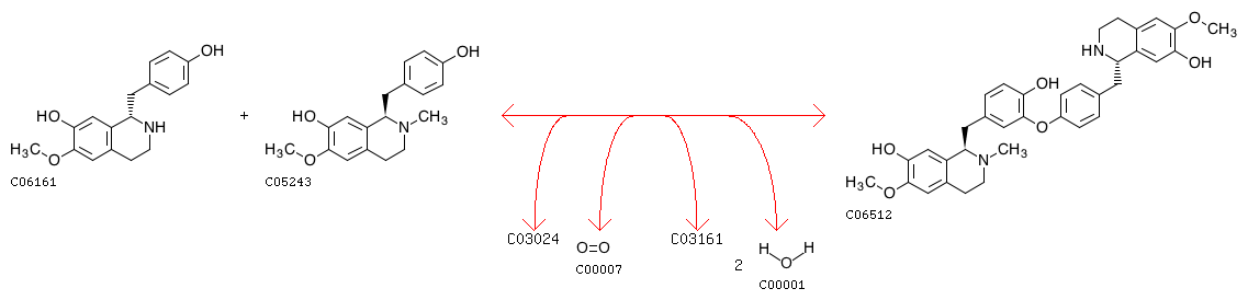 R05210 (S)-Coclaurine + (R)-N-Methylcoclaurine + [Reduced NADPH---hemoprotein reductase] + Oxygen <=> 2'-Norberbamunine + [Oxidized NADPH---hemoprotein reductase] + 2 H2O