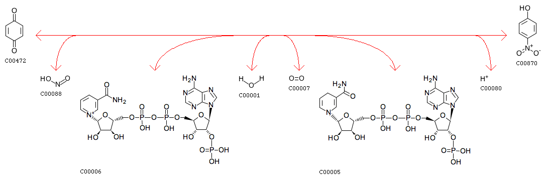 R05258 p-Benzoquinone + Nitrite + NADP+ + H2O <=> 4-Nitrophenol + Oxygen + NADPH + H+
