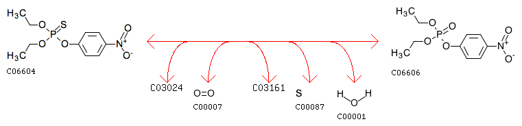 R05259 Parathion + [Reduced NADPH---hemoprotein reductase] + Oxygen <=> Paraoxon + [Oxidized NADPH---hemoprotein reductase] + Sulfur + H2O