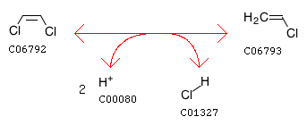 R05503 cis-1,2-Dichloroethene + 2 H+ <=> Vinyl chloride + Hydrochloric acid