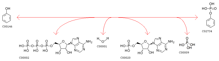 R05625 Phenol + ATP + H2O <=> Phenolic phosphate + AMP + Orthophosphate