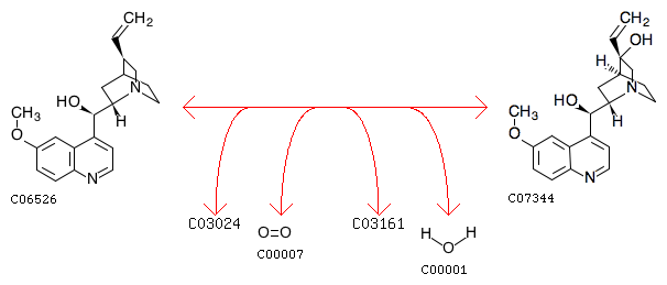 R05727 Quinine + [Reduced NADPH---hemoprotein reductase] + Oxygen <=> 3-Hydroxyquinine + [Oxidized NADPH---hemoprotein reductase] + H2O