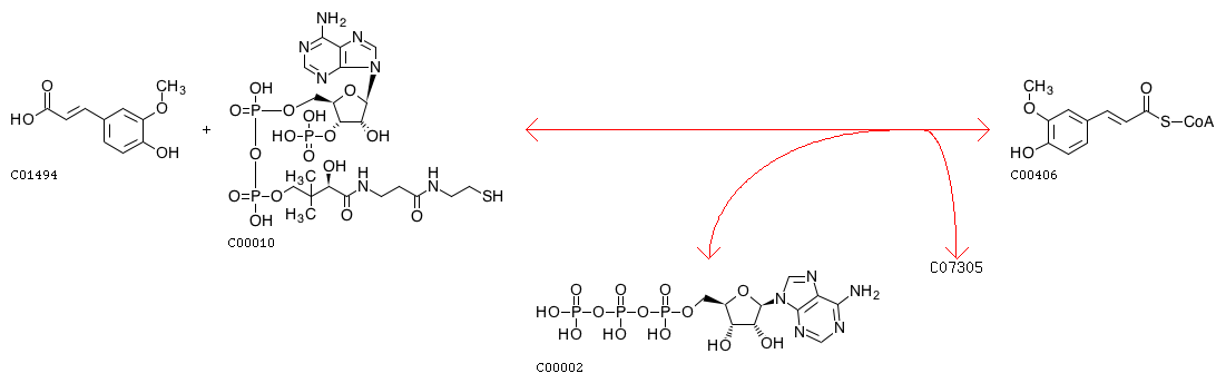 R05744 Ferulate + CoA + ATP <=> Feruloyl-CoA + Products of ATP breakdown