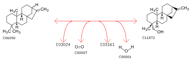 R06291 ent-Kaurene + [Reduced NADPH---hemoprotein reductase] + Oxygen <=> Kaur-16-en-18-ol + [Oxidized NADPH---hemoprotein reductase] + H2O