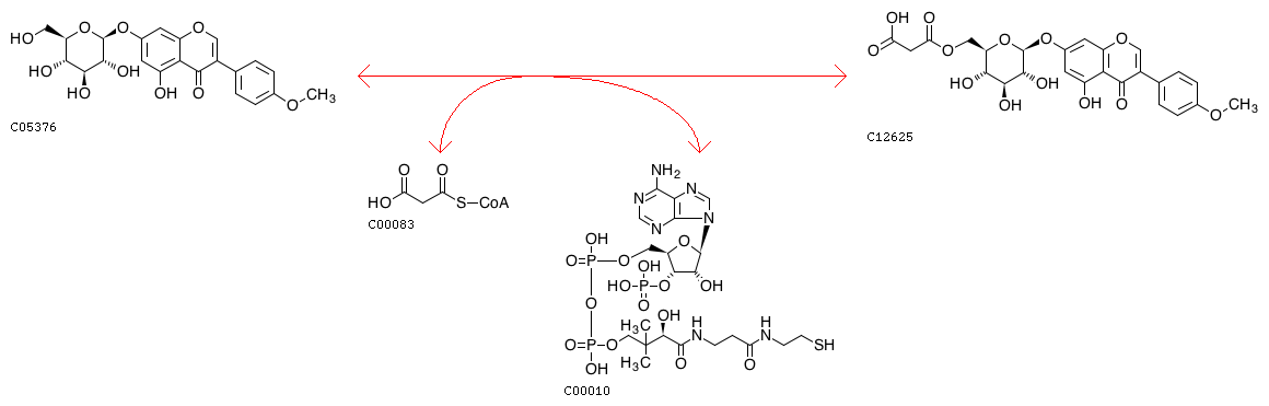 R06796 Biochanin A-beta-D-glucoside + Malonyl-CoA <=> Biochanin A 7-O-(6-O-malonyl-beta-D-glucoside) + CoA