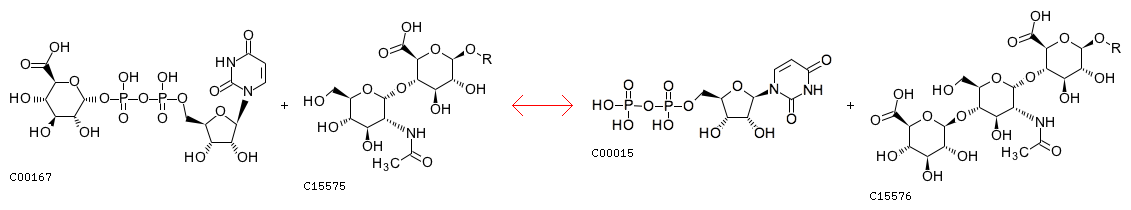 R07335 UDP-glucuronate + N-Acetyl-alpha-D-glucosaminyl-(1->4)-beta-D-glucuronosylproteoglycan <=> UDP + beta-D-Glucuronosyl-(1->4)-N-acetyl-alpha-D-glucosaminyl-(1->4)-beta-D-glucuronosylproteoglycan
