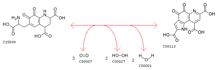 R07353 6-(2-Amino-2-carboxyethyl)-7,8-dioxo-1,2,3,4,7,8-hexahydroquinoline-2,4-dicarboxylate + 3 Oxygen <=> PQQ + 2 Hydrogen peroxide + 2 H2O