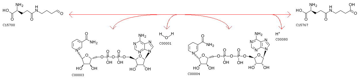 R07417 gamma-Glutamyl-gamma-aminobutyraldehyde + NAD+ + H2O <=> 4-(L-gamma-Glutamylamino)butanoate + NADH + H+