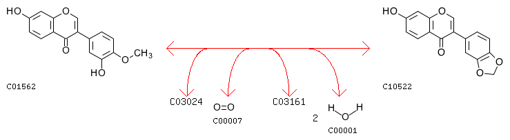 R07745 Calycosin + [Reduced NADPH---hemoprotein reductase] + Oxygen <=> Pseudobaptigenin + [Oxidized NADPH---hemoprotein reductase] + 2 H2O