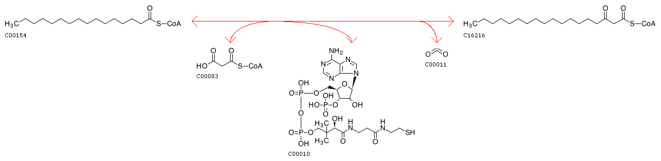 R07758 Malonyl-CoA + Palmitoyl-CoA <=> 3-Oxostearoyl-CoA + CoA + CO2