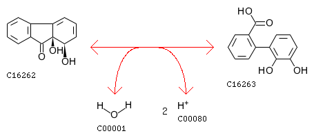 1-Hydro-1,1a-dihydroxy-9-fluorenone + H2O <=> 2,3-Dihydroxy-2'-carboxybiphenyl + 2 H+