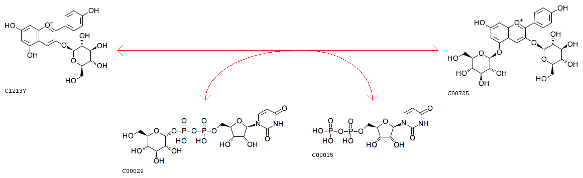 R07874 Pelargonidin 3-O-glucoside + UDP-glucose <=> Pelargonin + UDP