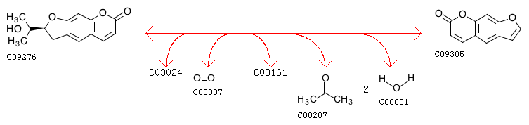 R08207 Marmesin + [Reduced NADPH---hemoprotein reductase] + Oxygen <=> Psoralen + [Oxidized NADPH---hemoprotein reductase] + Acetone + 2 H2O