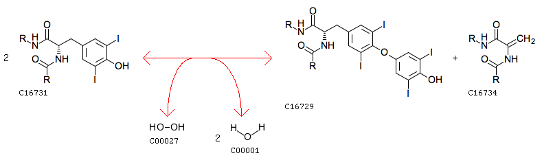 R08523 2 [Thyroglobulin]-3,5-diiodo-L-tyrosine + Hydrogen peroxide <=> [Thyroglobulin]-L-thyroxine + Thyroglobulin dehydroalanine + 2 H2O