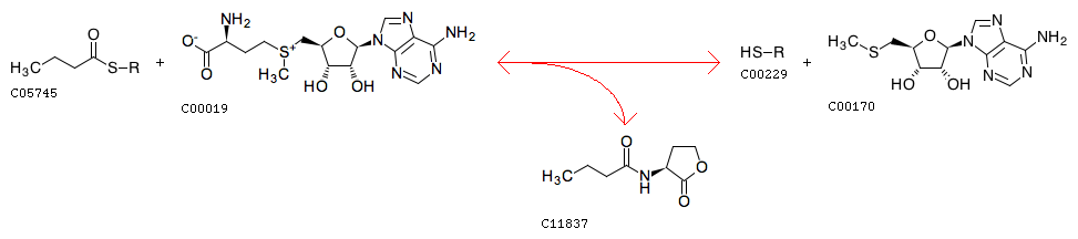 R08939 Butyryl-[acp] + S-Adenosyl-L-methionine <=> Acyl-carrier protein + 5'-Methylthioadenosine + N-Butyryl-L-homoserine lactone