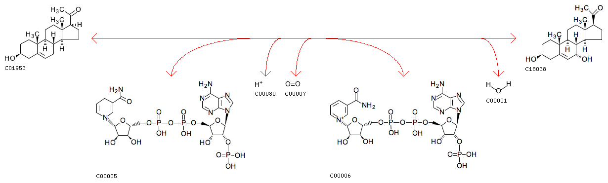 R08943 Pregnenolone + NADPH + H+ + Oxygen <=> 7alpha-Hydroxypregnenolone + NADP+ + H2O
