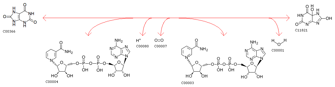 R09514 Urate + NADH + H+ + Oxygen <=> 5-Hydroxyisourate + NAD+ + H2O