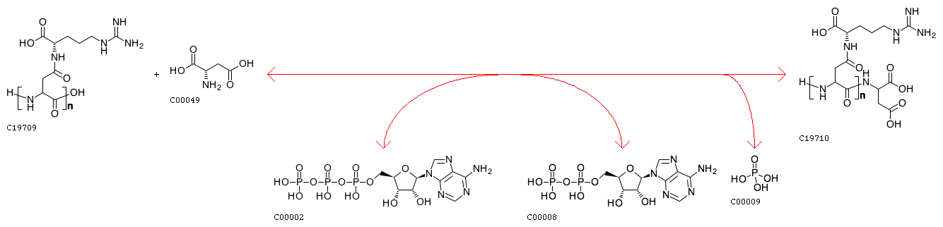 R09592 ATP + [L-Asp(4-L-Arg)]n + L-Aspartate <=> ADP + Orthophosphate + [L-Asp(4-L-Arg)]n-L-Asp