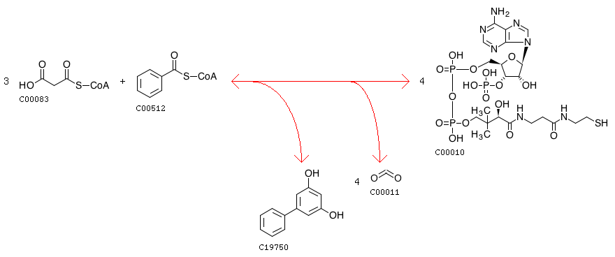 R09621 3 Malonyl-CoA + Benzoyl-CoA <=> 4 CoA + 3,5-Dihydroxybiphenyl + 4 CO2