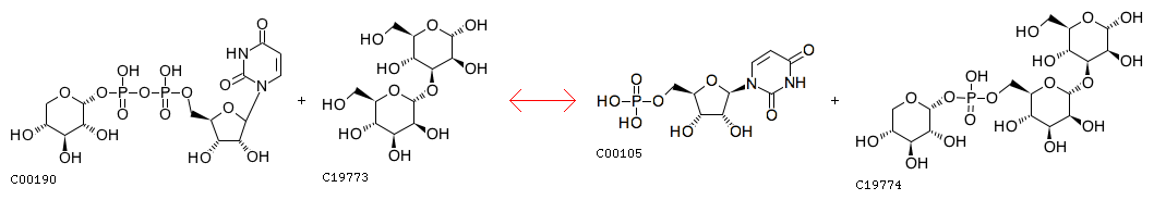 R09642 UDP-D-xylose + 3-O-alpha-D-Mannopyranosyl-alpha-D-mannopyranose <=> UMP + 3-O-(6-O-alpha-D-Xylosylphospho-alpha-D-mannopyranosyl)-alpha-D-mannopyranose