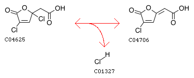2,4-Dichloro-2,5-dihydro-5-oxofuran-2-acetate <=> cis-2-Chloro-4-carboxymethylenebut-2-en-1,4-olide + Hydrochloric acid