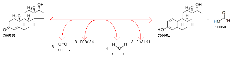 R10511 Testosterone + 3 Oxygen + 3 [Reduced NADPH---hemoprotein reductase] <=> Estradiol-17beta + Formate + 4 H2O + 3 [Oxidized NADPH---hemoprotein reductase]