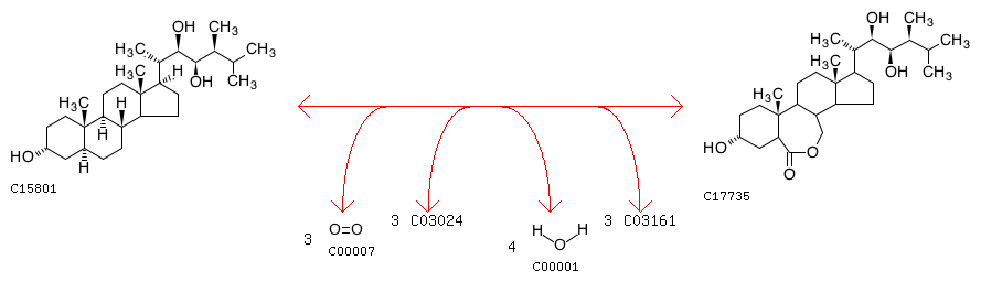 R10683 6-Deoxotyphasterol + 3 Oxygen + 3 [Reduced NADPH---hemoprotein reductase] <=> 7-Oxatyphasterol + 4 H2O + 3 [Oxidized NADPH---hemoprotein reductase]