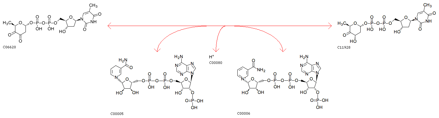 R11051 dTDP-3,4-dioxo-2,6-dideoxy-D-glucose + NADPH + H+ <=> dTDP-4-oxo-2,6-dideoxy-D-allose + NADP+