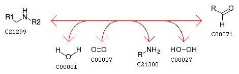 RCH2NHR' + H2O + Oxygen <=> Aldehyde + R'NH2 + Hydrogen peroxide