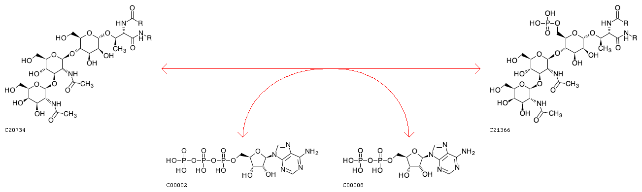 ATP + 3-O-[N-Acetyl-beta-D-galactosaminyl-(1->3)-N-acetyl-beta-D-glucosaminyl-(1->4)-alpha-D-mannosyl]-L-threonyl-[protein] <=> ADP + 3-O-[N-Acetyl-beta-D-galactosaminyl-(1->3)-N-acetyl-beta-D-glucosaminyl-(1->4)-alpha-D-(6-phospho)mannosyl]-L-threonyl-[protein]